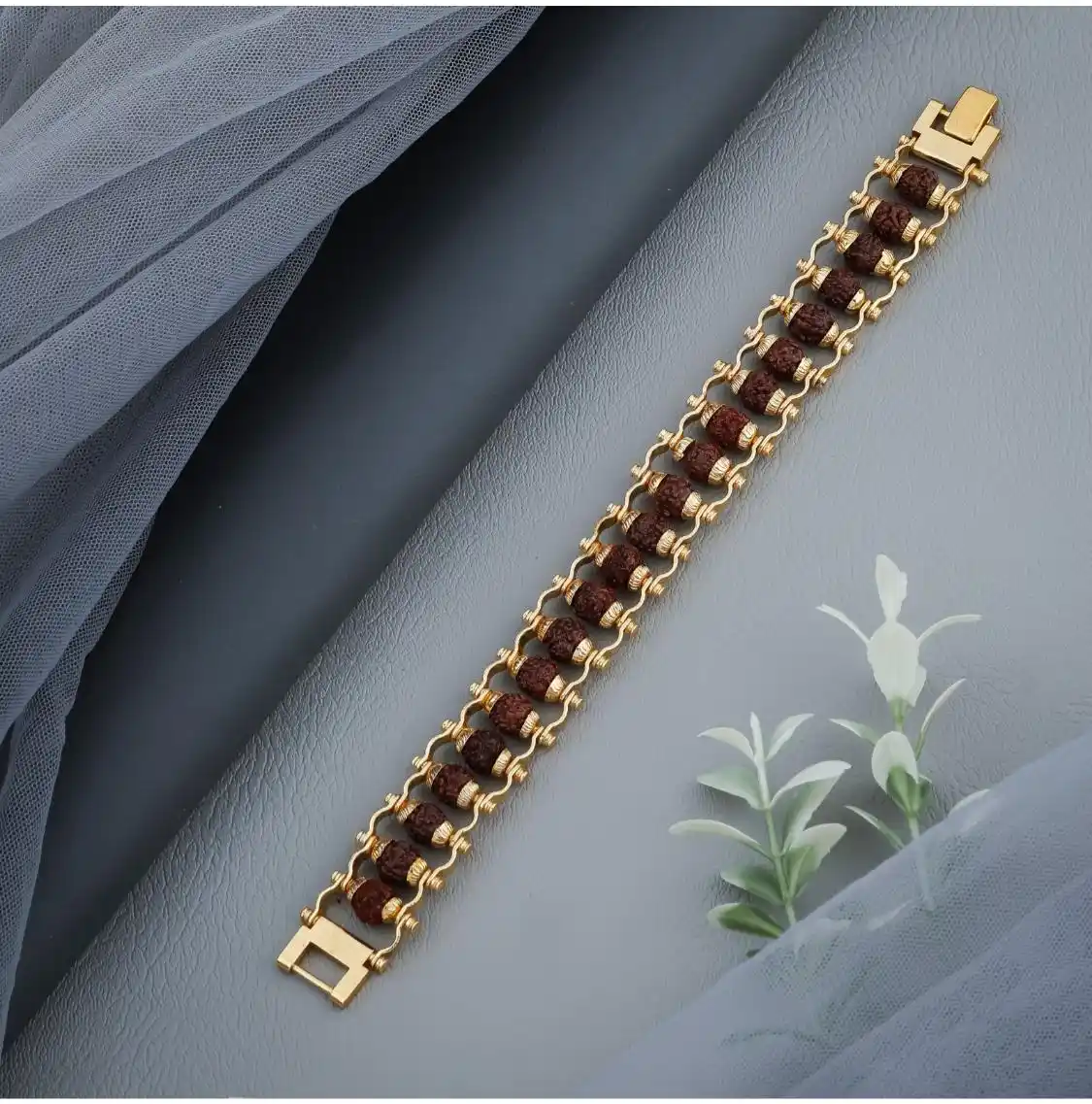 Brass Rudraksha Bracelet For Men 5 Mukhi Rudraksha Beads Embedded in Gold Plated