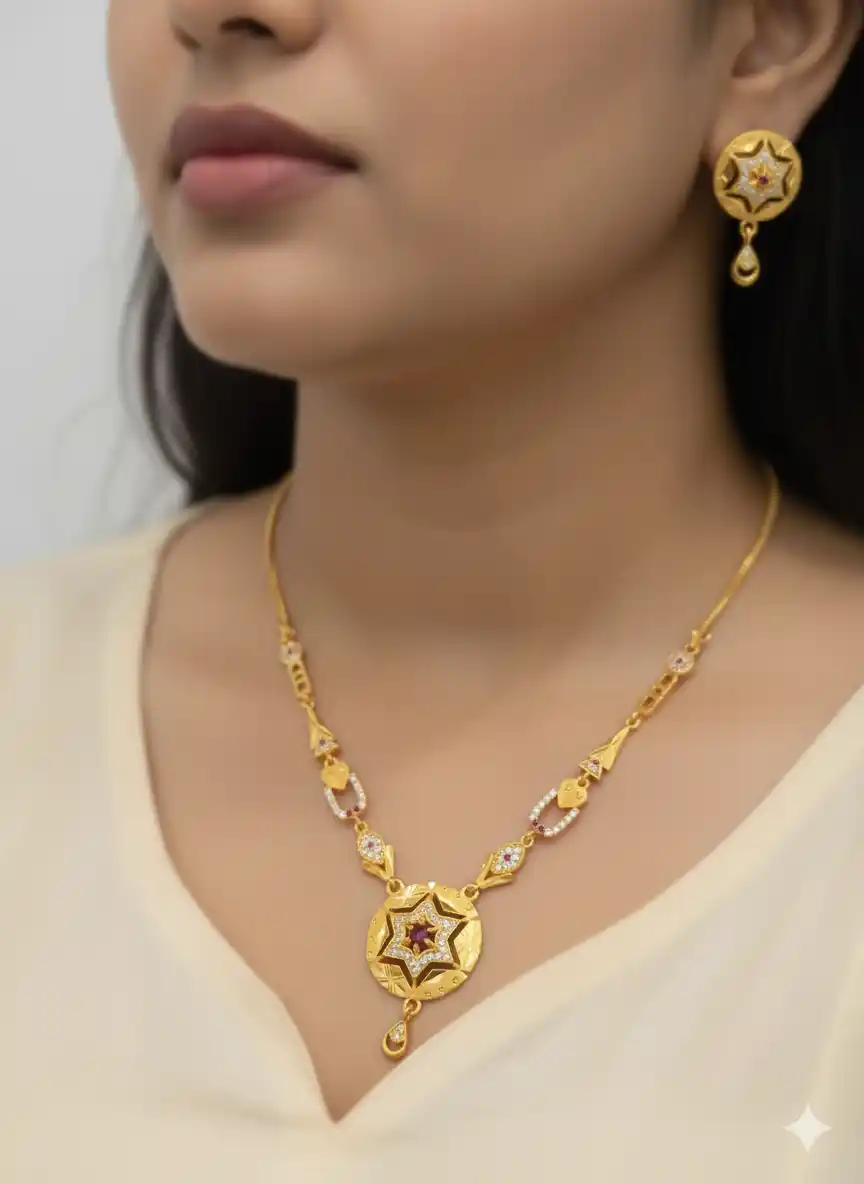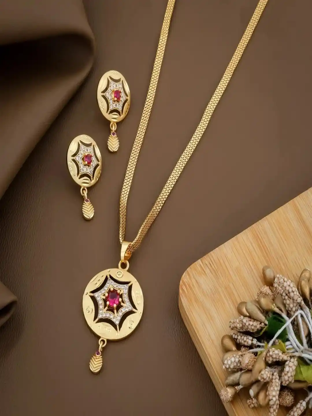 Royal Starburst Ruby Gold-Plated Necklace & pendent Earring Set with adjustable ring