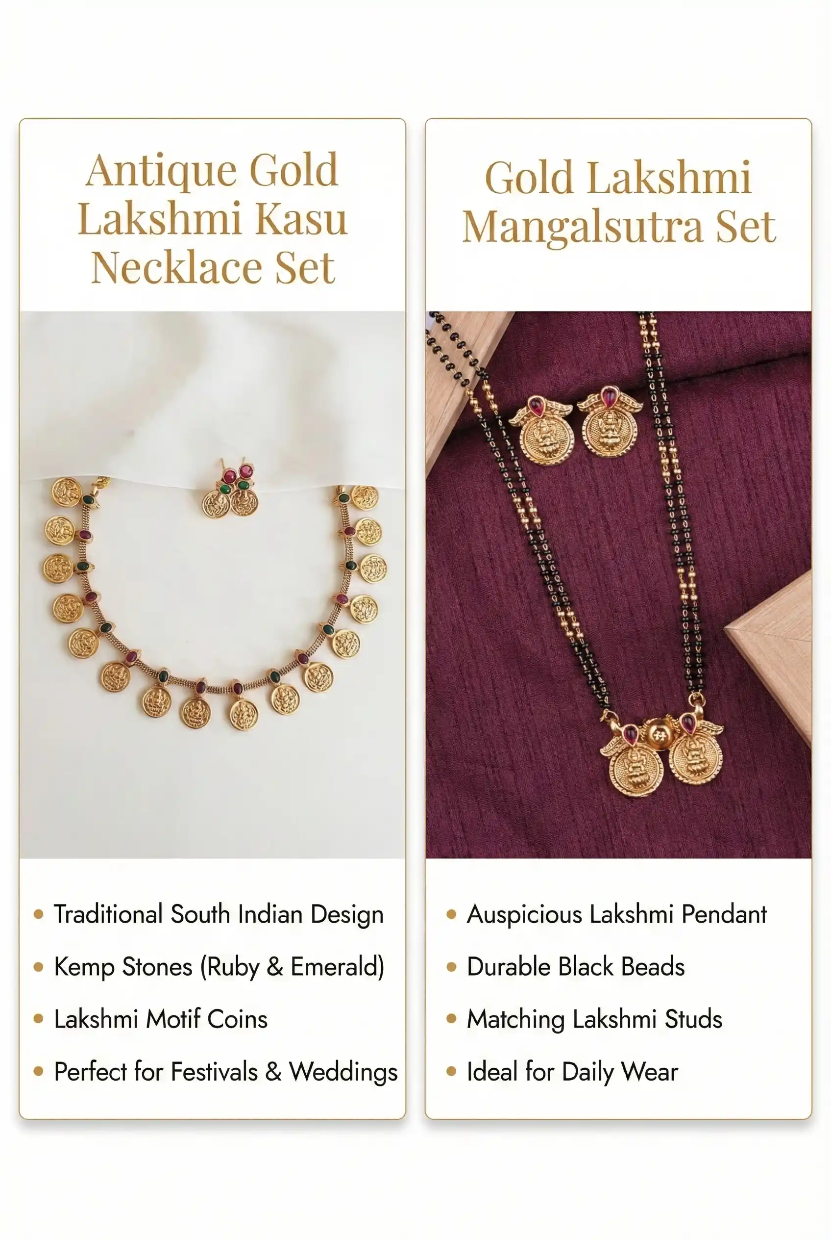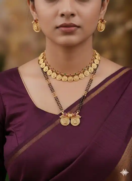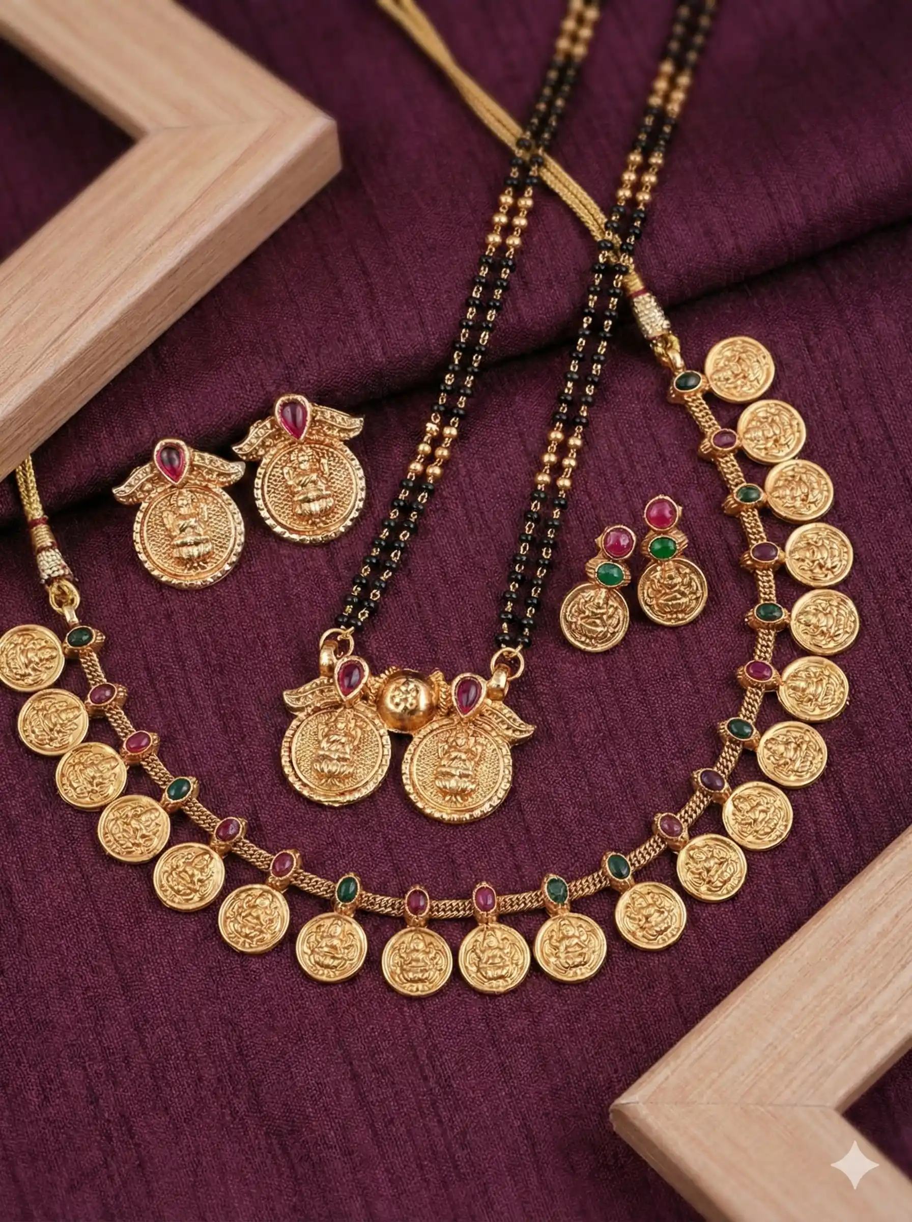 Traditional Antique Gold Coin Necklace Set with Black Beads – South Indian Temple Jewellery